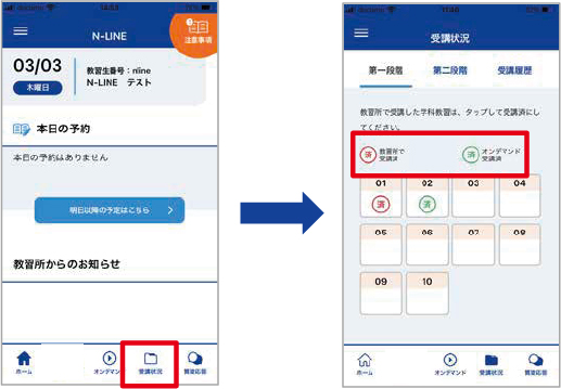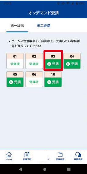 • オンデマンド教習で受講が完了した教習は緑色の「済」マークが自動で付きます。